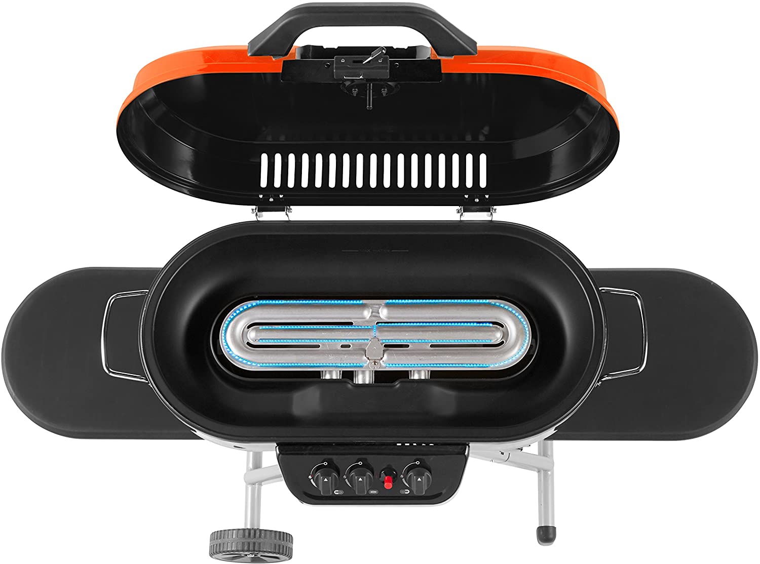 This portable stand-up propane grill provides a high-output cooking surface with multiple independently controlled heating zones, allowing for more precise temperature management while preparing different foods at the same time. With a large grilling area and durable construction, it is suitable for camping, outdoor gatherings, tailgating, or patio cooking.